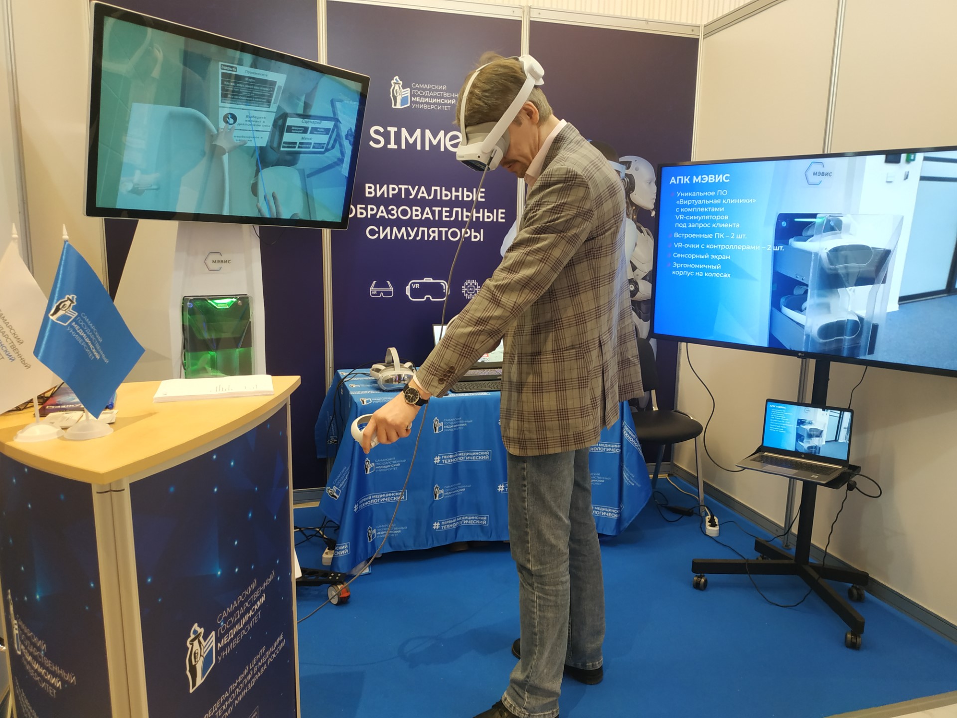 В выставочной зоне конгресса располагалось оборудование ведущих производителей средств симуляционного обучения, включая VR‑симуляторы, манекены и решения на базе технологий расширенной реальности XR. На стенде СамГМУ было представлено VR-оборудование ИИР СамГМУ: Программно-аппаратный комплекс «МЭВИС» и различные VR-тренажеры для медицинского образования и профессиональной подготовки.